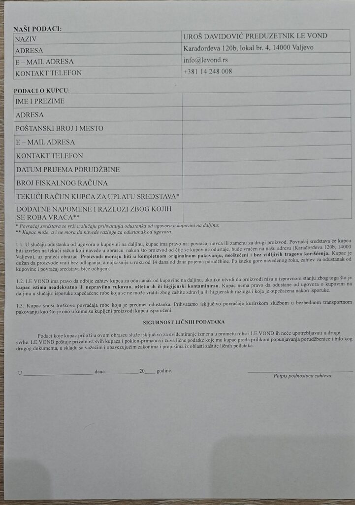 Reklamacije se podnose u skladu sa propisanim procedurama za zaštitu prava kupaca. Reklamacije se podnose na email adresu reklamacije@levond.rs